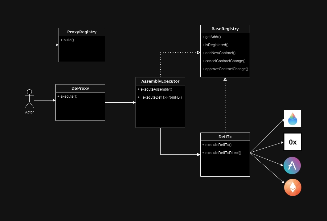 So Defi transactions are grouped together and they are executed in sequence via AssemblyExecutor contract. This is how a user can make an assembly of defi transactions and execute them in one transaction.
