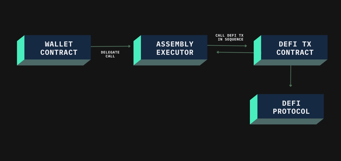 In this case, the user would use three separate DeFi Transaction Contracts, each responsible for a specific step of the Assembly. By connecting these contracts together, the user can form a cohesive sequence that achieves their desired outcome.